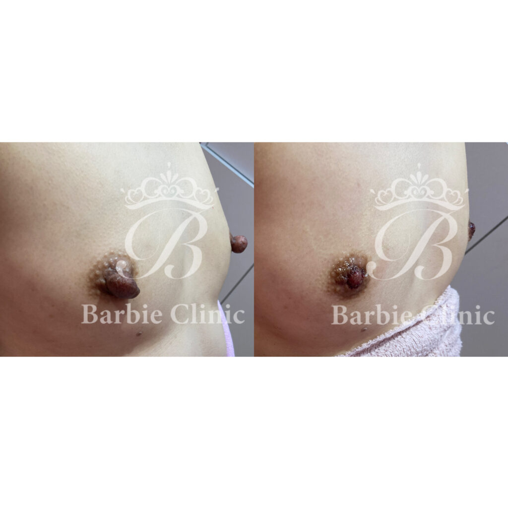 Barbie Clinicの乳頭/乳輪縮小術では抜糸不要であること、そして乳頭縮小や乳輪縮小を行う際にマーキング範囲内のモントゴメリーに関してはコストフリー、料金なしのでご提供であることが特長です。どんなモントゴメリーも全て料金の範囲内でやります、ということではないのでその点は悪しからずでございます・・・。